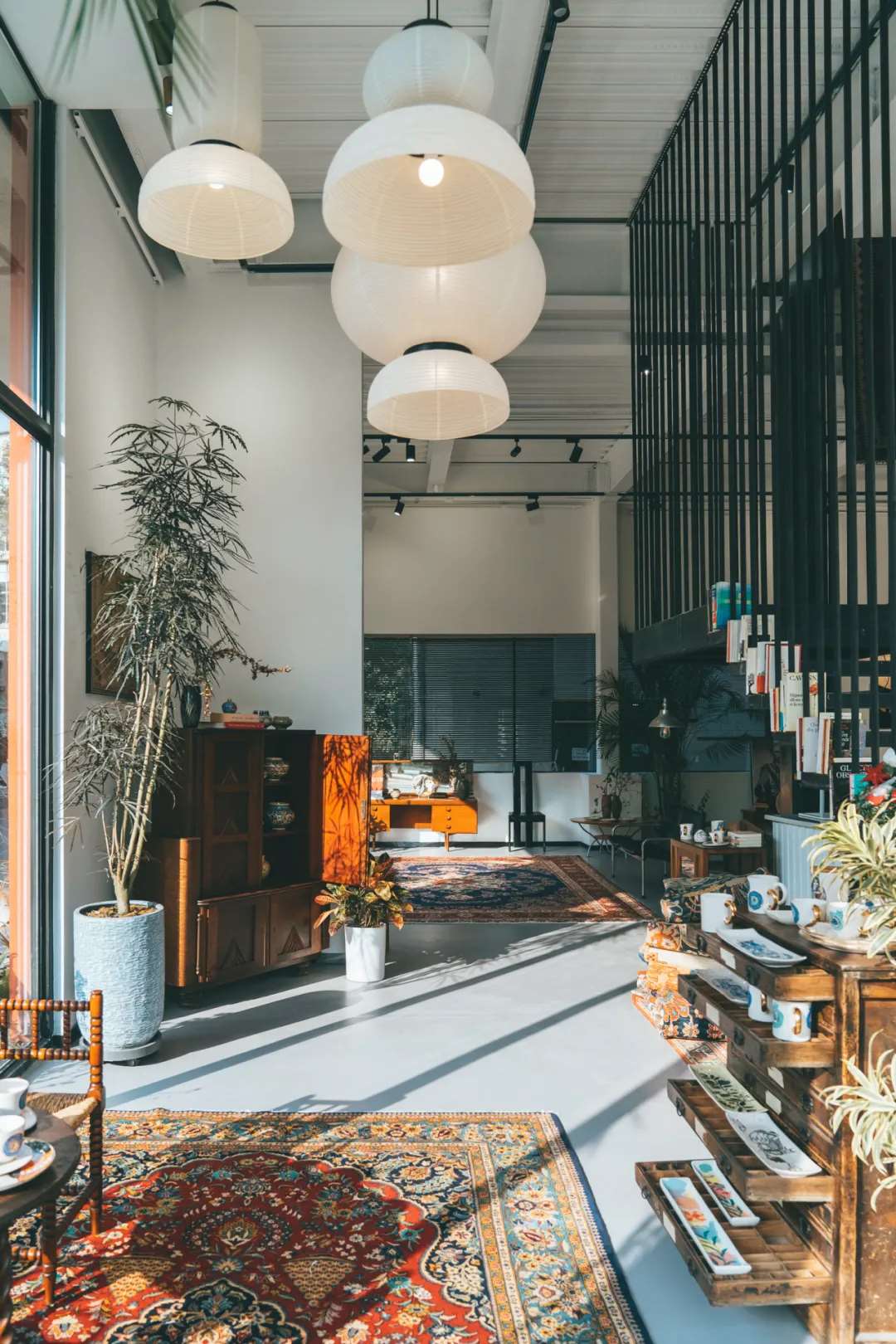 以波斯古法地毯为主营的Zamani,大部分产品都繁复艳丽。建筑内部通体白墙,波斯与南亚风情的地毯、家具,种类繁多的绿植穿插其中,盈而不满,色彩丰富的地毯成为了空间的主角。繁与简之间,整个空间便有了呼吸感。